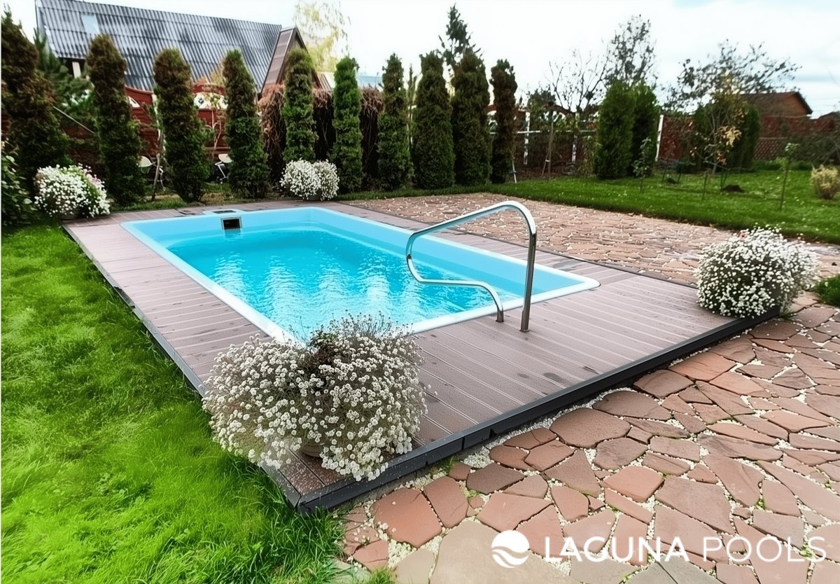 Прямоугольный композитный бассейн с террасной доской
