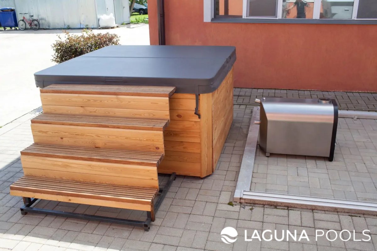 Гидромассажная ванна с деревянной отделкой на плиточной площадке с лестницей